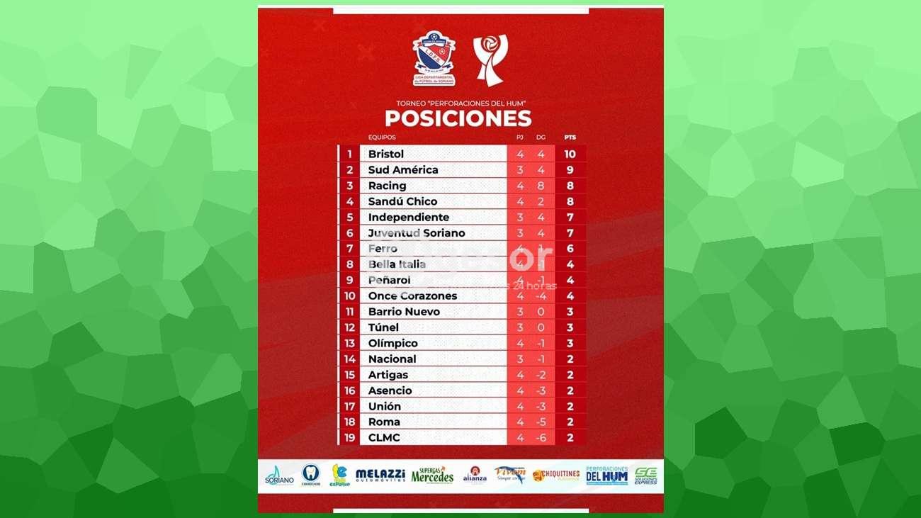 Bristol, con 10 puntos, lidera la tabla de posiciones del fútbol mercedario, tras la disputa de la cuarta fecha cumplida este domingo. Lo siguen Sud América con 9 puntos , Racing y Sandú Chico con 8.