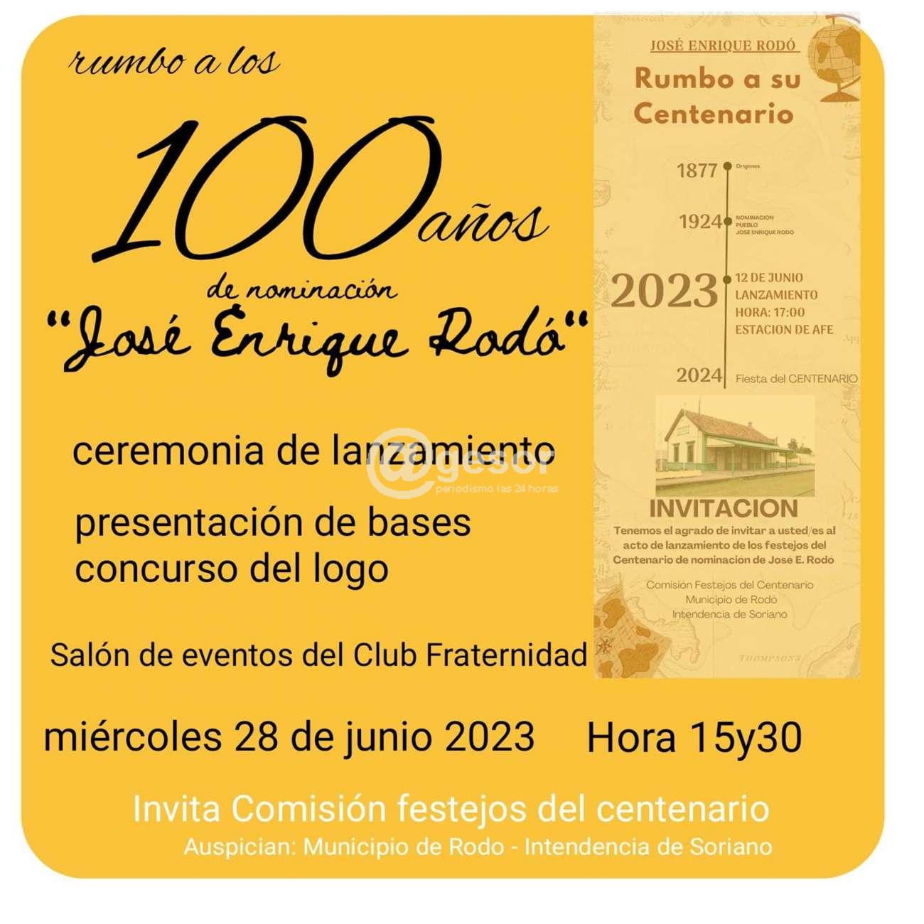 Este miércoles 28 a las 15.30 horas con la invitación de la Comisión de Festejos del Centenario, el auspicio del Municipio de Rodó y de la Intendencia de Soriano, en el salón de eventos del Club Fraternidad se realizará la ceremonia de lanzamiento rumbo a los 100 años de nominación de José Enrique Rodó, de la presentación de bases de lo que será el concurso del logo.