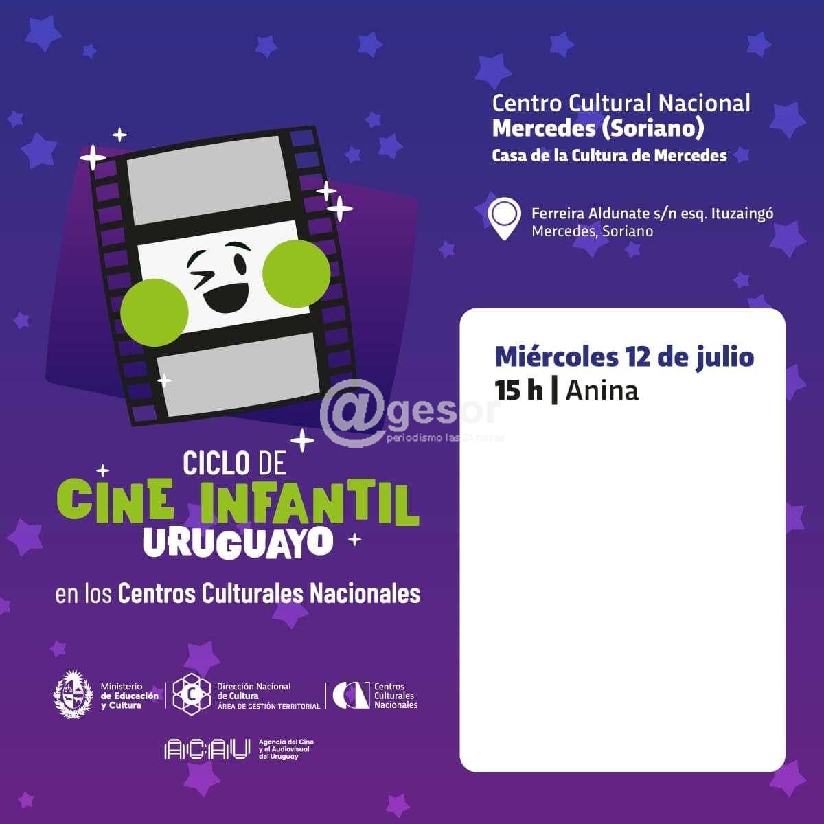 Con la organización de los Centros Culturales Nacionales, Ministerio de Educación y Cultura, Dirección Nacional de Cultura Area de Gestión Territorial, la Agencia del Cine y el Audiovisual del Uruguay, el apoyo de la Intendencia de Soriano, se lleva en el Centro Cultural Nacional Mercedes "Casa de la Cultura", este miércoles 12 de julio en el marco del ciclo de cine infantil uruguayo, estará ofreciéndose a partir de las 15.00 horas la película Anina.