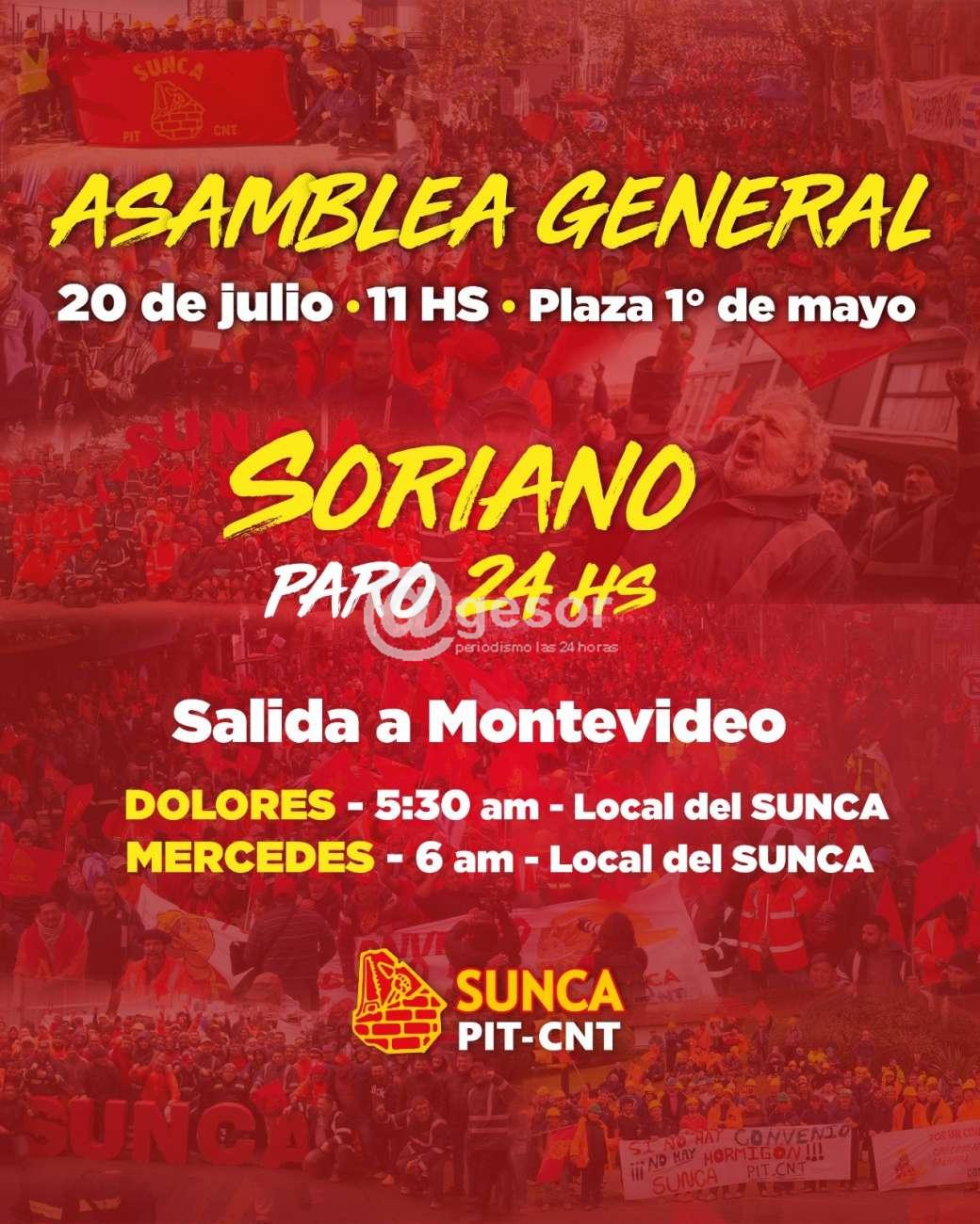 Como adelantara @gesor en su momento, este jueves 20, el SUNCA estará realizando asamblea general a las 11.00 horas en plaza 1º de Mayo en Montevideo, para lo cual y con la finalidad que puedan participar trabajadores de diferentes puntos del país, se realizará paro de actividades a nivel nacional durante 24 horas, incluyendo Soriano.