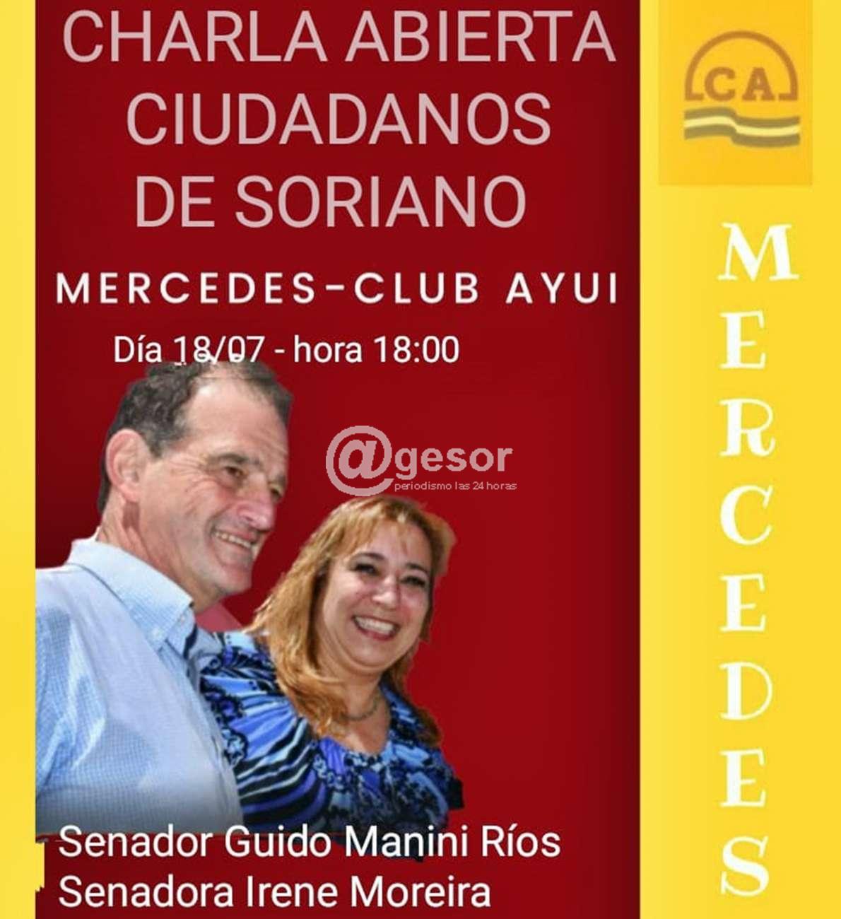 Este martes 18 a partir de las 18.00 horas en salón del Club El Ayuí, en Mercedes, el líder de Cabildo Abierto y Senador de la República, Guido Manini Ríos, junto a la exMinistra de Vivienda y actual Senadora Irene Moreira, estarán brindando charla abierta al público en general.