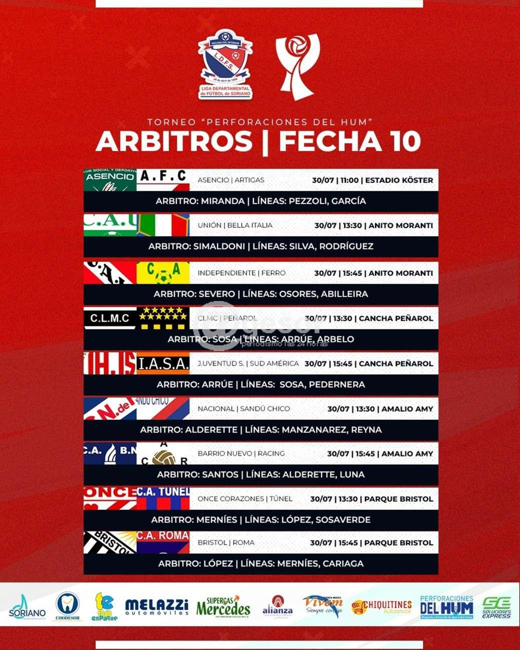 La Liga Departamental de Fútbol de Soriano, informó las ternas arbitrales designadas por el Colegio de Arbitros que serán las responsables de conducir los encuentros de la 10ª fecha del torneo Clasificatorio "Perforaciones del Hum" de primera división, que se disputará íntegramente este domingo 30.