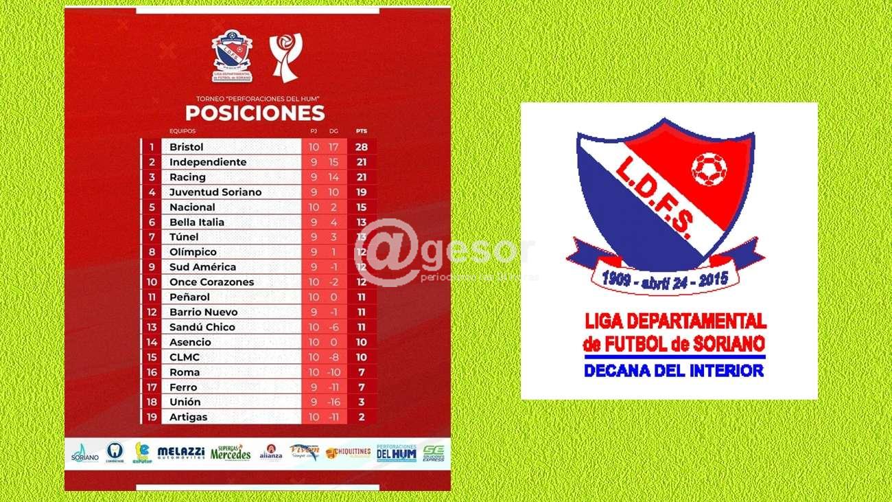 Bristol se afianza en el liderazgo de la tabla de posiciones del fútbol mercedario aventajando por siete puntos a los segundos, Independiente y Racing. En el otro extremo se ubica Artigas con solamente 2 puntos.