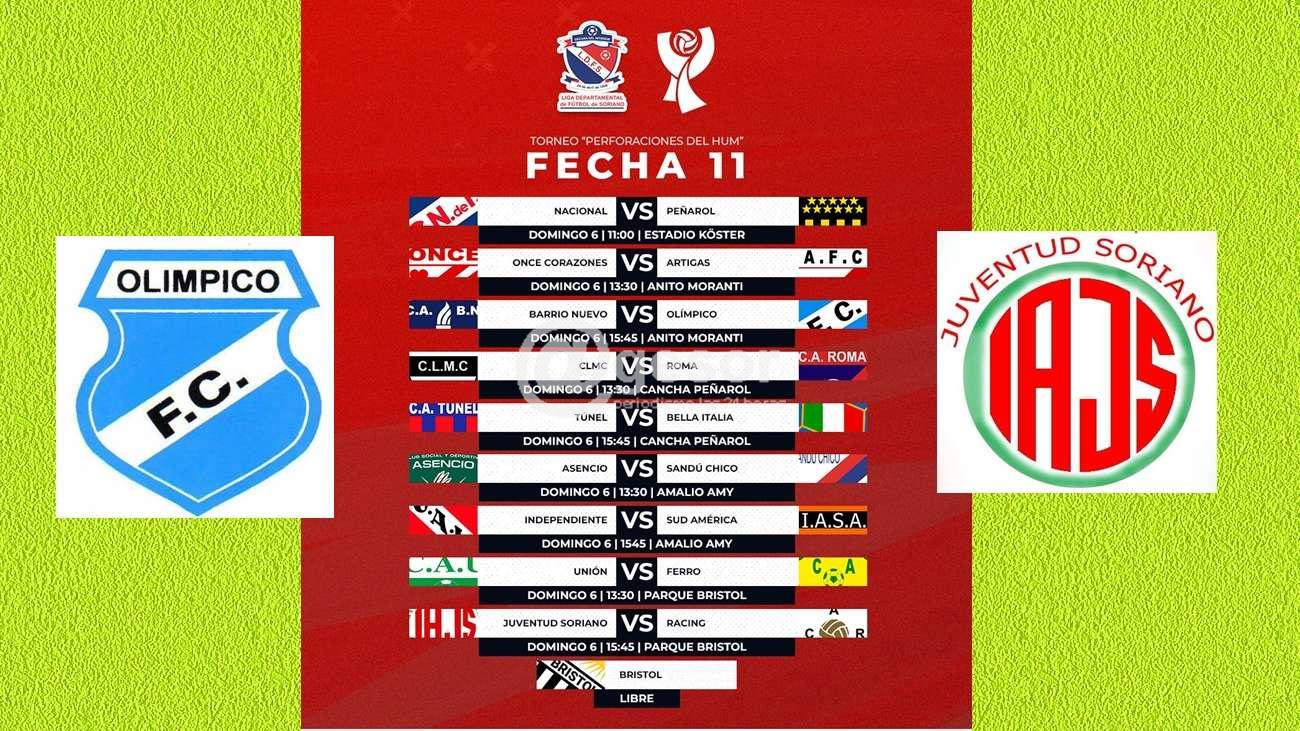 Se reunió la Liga Departamental de Fútbol de Soriano bajo la presidencia del Dr. Pablo Marrero informó todos los detalles de la fecha 11 del Torneo de Fútbol de Mercedes " Perforaciones del HUM" , del próximo domingo con grandes encuentros, comenzado la mañana con el clásico entre Nacional vs Peñarol hora 11 en el Estadio Luis Koster. En el Moranti, a primera hora, 13 y 30 juegan Once Corazones vs Artigas y a segunda hora 15y 30 otro gran partido entre Barrio Nuevo vs Olímpico- En cancha de Peñarol juegan a primera hora CLMC y Roma hora 13 y 30 y a segunda hora dos equipos que viene en zona alta, Túnel vs la sorpresa Bella Italia. En el Amy, Asencio vs Sandú chico a primera hora y a segunda gran encuentro entre Independiente vs Sud América. En cancha de Bristol, a primera hora juegan Unión vs Ferro por salir de la zona de abajo, y a segunda hora el gran encuentro de la fecha, Juventud Soriano vs Racing.