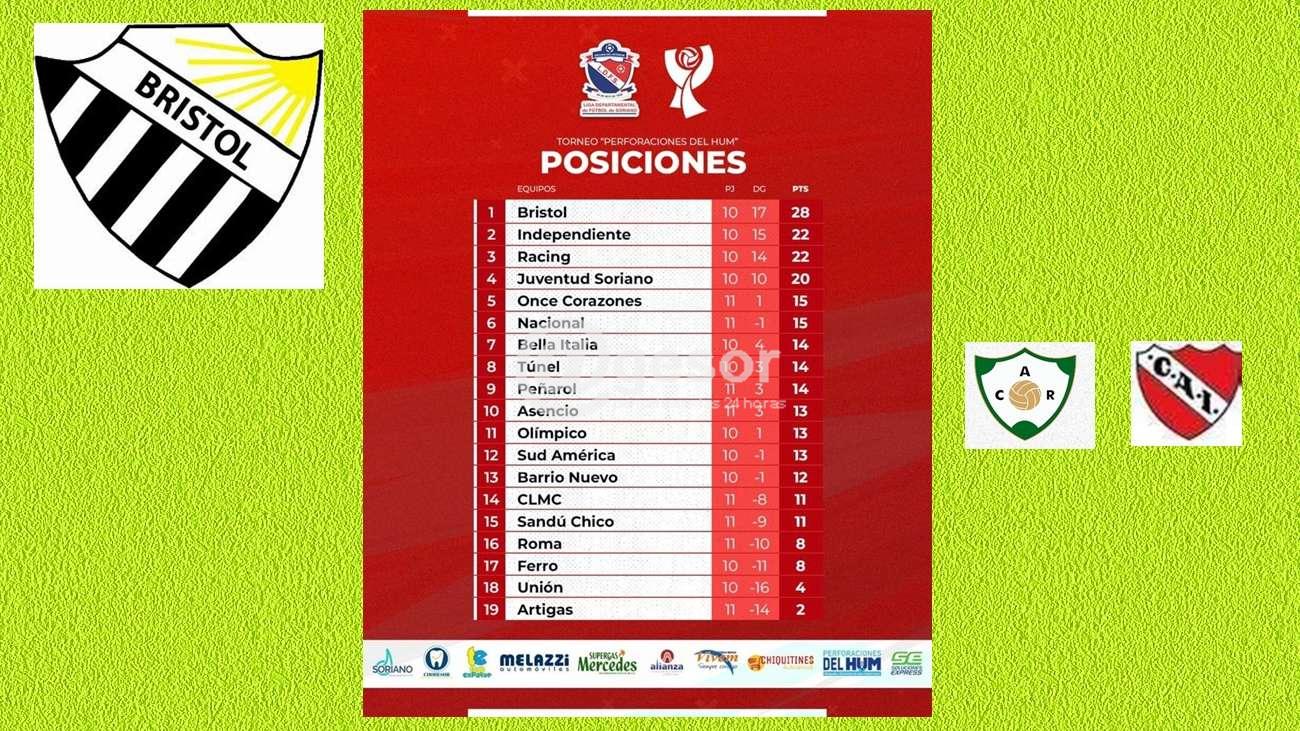 Sin jugar, por tener fecha libre, Bristol continúa siendo el líder cómodo de la tabla de posiciones del fútbol de Mercedes. Aventaja a Racing e Independiente, los segundos por 6 puntos.