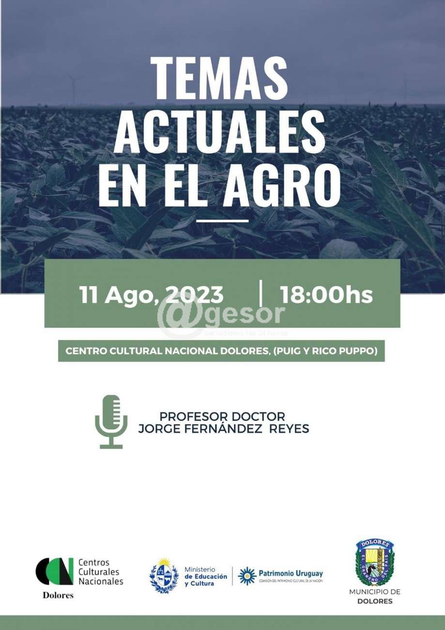 Este viernes 11 de agosto a partir de las 18.00 horas en el Centro Cultural Nacional Dolores ubicado en Puig y Rico Puppo, estará ofreciéndose charla a cargo del Prof. Dr. Jorge Fernández Reyes sobre "Temas actuales en el agro".