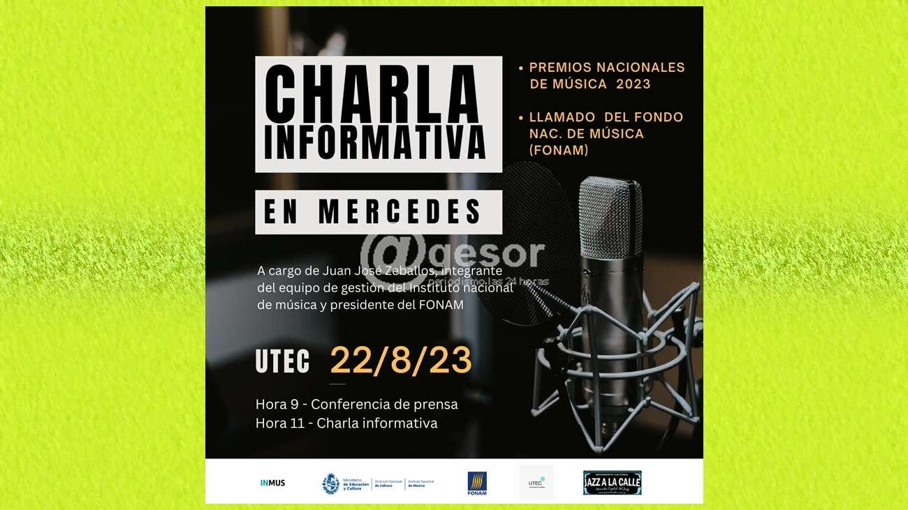 El martes 22 de agosto se realizará una charla informativa sobre los Premios nacionales de música 2023 y el Fondo Nacional de Música (FONAM). Será en la UTEC Mercedes, cargo de Juan José Zeballos, integrante del equipo de gestión del Instituto Nacional de Música, y presidente del FONAM.