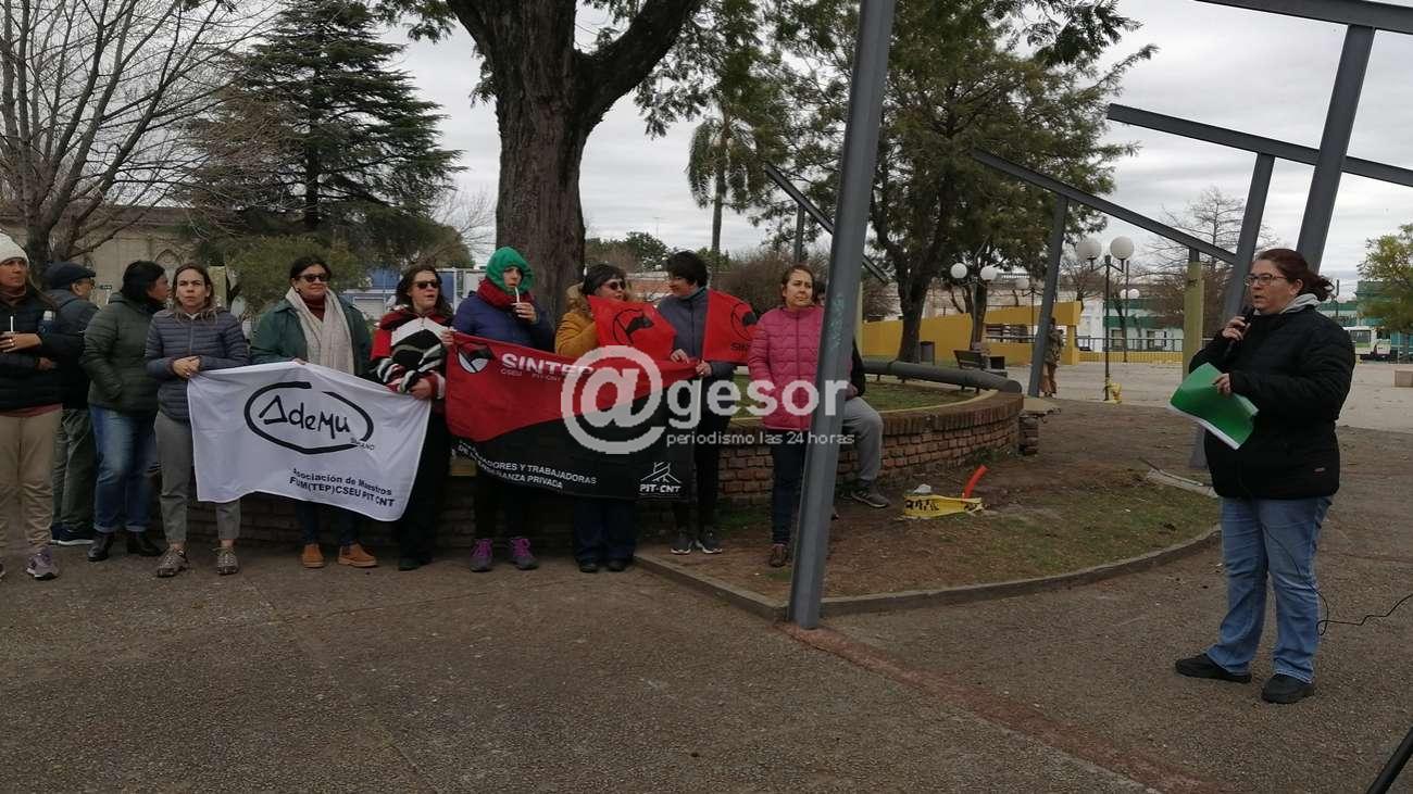 ADEMU  (Asociación de Maestros del Uruguay)  Soriano realizó  un paro de  24 horas este martes, sumándose a la medida adoptada por la filial Montevideo.  En el acto realizado en Plaza Artigas de Mercedes Walkolda Espinosa  relató la situación que  atraviesan los maestros, refiriéndose a los cambios impuestos a la educación primaria. Cuestionando las transformaciones que se pregonan de la Reforma Educativa. “En una clase podemos encontrar entre 18 y 35 alumnos con diferentes  niveles de aprendizaje  yd e conducta. Agreguemos a ello la inclusión de niños diagnosticados y otros que no. ¿Y eso fue contemplado en esta transformación educativa? Por supuesto que no. Se nos exige que contemplemos a todos nuestros alumnos en el aula, y lo hacemos. Lo hacemos a razón de nuestro esfuerzo personal”. Agregando  “pero cuando nos enfrentamos con situaciones de violencia en el aula y tratamos de contemplar a todos  con el mismo respeto se nos agotan las estrategias, las modalidades, se buscan diferentes soluciones en la Escuela, pero lamentablemente muchas veces  no logramos cambios positivos. Tampoco hay alternativas desde las autoridades para cambiar estas situaciones. Tampoco hay una solución desde la Salud. Porque nos encontramos que Salud Pública  no hay pediatras y mucho menos especialistas. Ni hablemos cuando tenemos  niños que sufren de crisis en el aula. Cuántos docentes en estas situaciones tratando de calmar  o apaciguar al niño, tratando que no se lastime él o lastime a los demás, reciben golpes, mordeduras, heridas,  que muchas veces no las expresan y se las guardan para ellos.  Pero cuando se les propone a las  autoridades a ver qué podemos hacer  tampoco tenemos una rápida respuesta”.