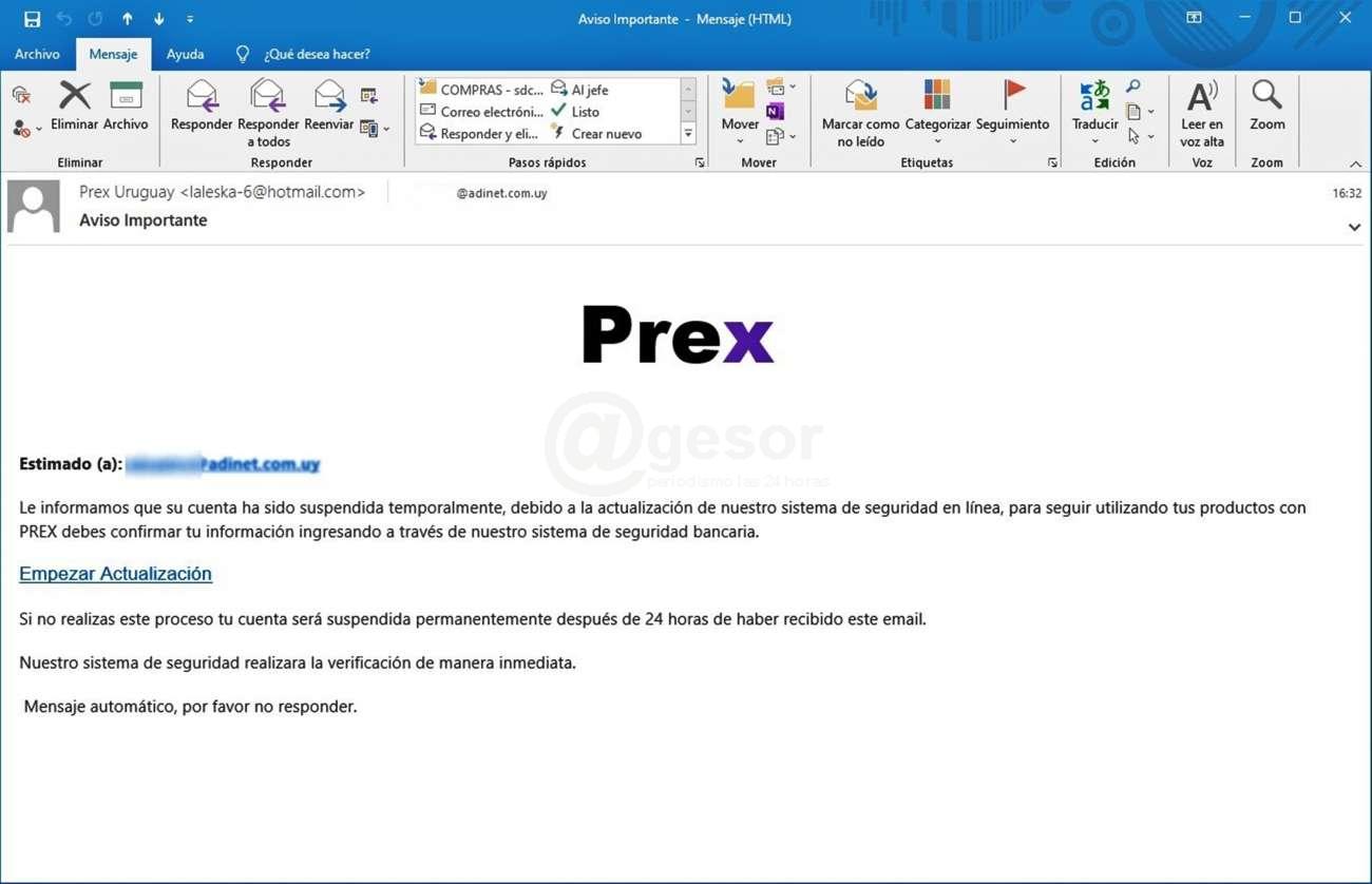 Usuario de la tarjeta Prex se comunicó con @gesor para informar y advertir de posible fraude a quienes utilizan esta tarjeta, debido a un correo que se hace llegar a través del correo electrónico personal donde se informa que su cuenta "ha sido suspendida temporalmente, debido a la actualización de nuestro sistema de seguridad en línea, para seguir utilizando tus productos con PREX, debes confirmar tu información ingresando a través de nuestro sistema de seguridad bancaria".