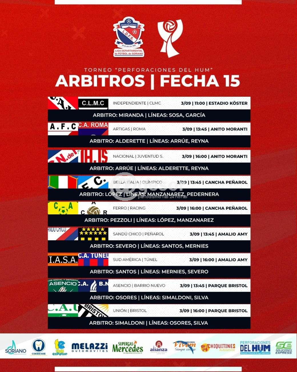 El Colegio de Arbitros de la Liga Departamental de Fútbol de Soriano designó las ternas para la 15ª fecha del Clasificatorio ¨Perforaciones del Hum¨ que estarán a cargo de conducir los juegos en primera división a disputarse en forma íntegra este domingo 3 de setiembre.