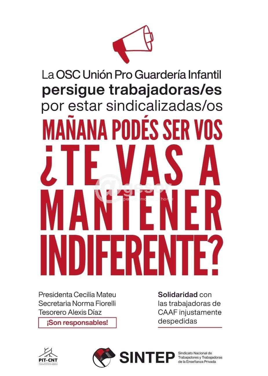 La OSC Unión Pro Guardería Infantil persigue trabajadoras/es por estas sindicalizados, mañana podés ser vos, ¿te vas a mantener indiferente?