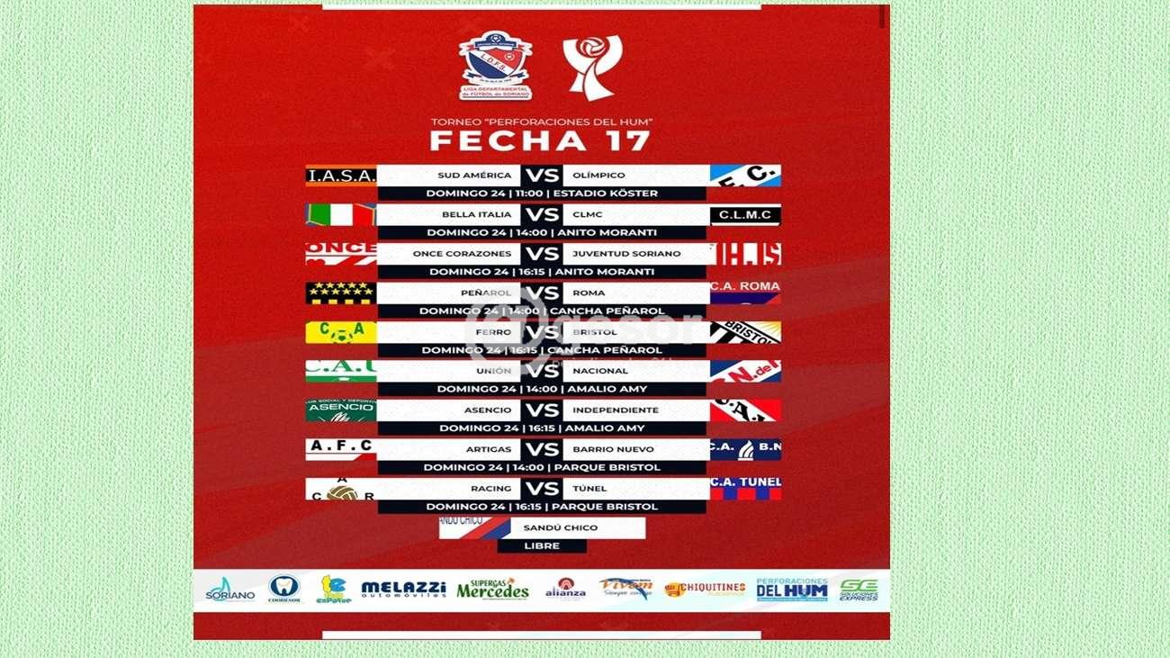 La fecha 17 dará comienzo este domingo 24 a la hora 11 en el Estadio Luis Koster en uno de los grandes partidos de la fecha entre Sud América vs Olímpico , luego ya en la tarde en el Moranti juegan a primera hora, Bella Italia vs CLMC y a segunda hora Once Corazones vs Juventud Soriano. En cancha de Peñarol juegan a la hora 14 Peñarol vs Roma y a la hora 16 y 15 Ferro vs Bristol. En el Amy juegan a primera hora Unión vs Nacional y a segunda hora lo hacen Asencio vs Independiente. En cancha de Bristol desde la hora 14 juegan Artigas vs Barrio Nuevo y desde la hora 16 lo hacen en otro gran partido Racing vs Túnel, queda libre Sandú chico.