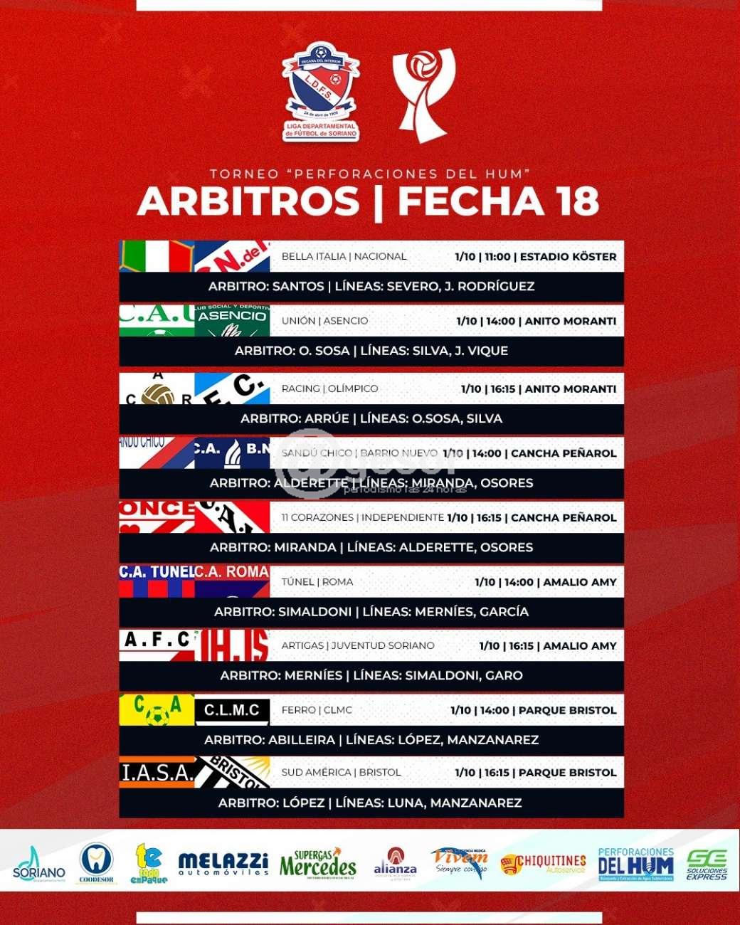 El Colegio de Arbitros designó a quienes tendrán a su cargo la dirección de los partidos de la penúltima fecha del Clasificatorio ¨Perforaciones del Hum¨ en el fútbol mercedario de primera división, que estará disputándose íntegramente durante este domingo 1 de octubre y que se iniciará a las 11.00 horas con el juego entre Bella Italia y Nacional en el encuentro televisado en el estadio "Luis Köster" a las 11.00 horas por el canal de cable local CV10, con el arbitraje de Santos, secundado por Severo y J. Rodríguez.