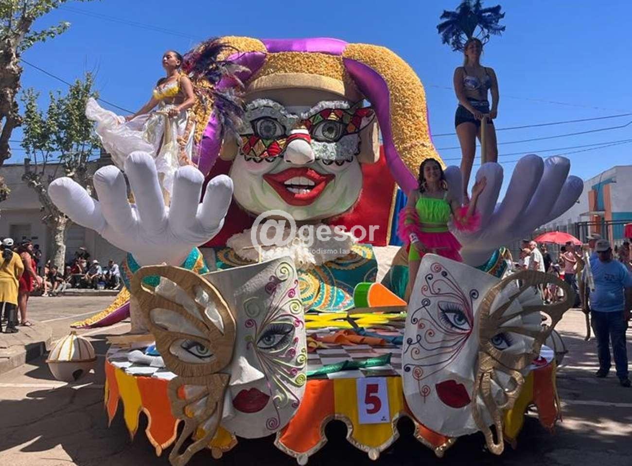 CARROZA N° 5 ¨Ráfaga de Carnaval¨, de los Grupos Unidos de Escuela Técnica Dolores expresan su propuesta: "En una pequeña ciudad llamada Dolores, ubicada en un rincón del país, donde la Primavera era la estación más esperada del año, se encontró la excusa perfecta para pintarse la cara y ponerse el antifaz: la Fiesta Nacional de la Primavera, evento tan espectacular que hacía que cada año la ciudad se llenara de vida, color y alegría.