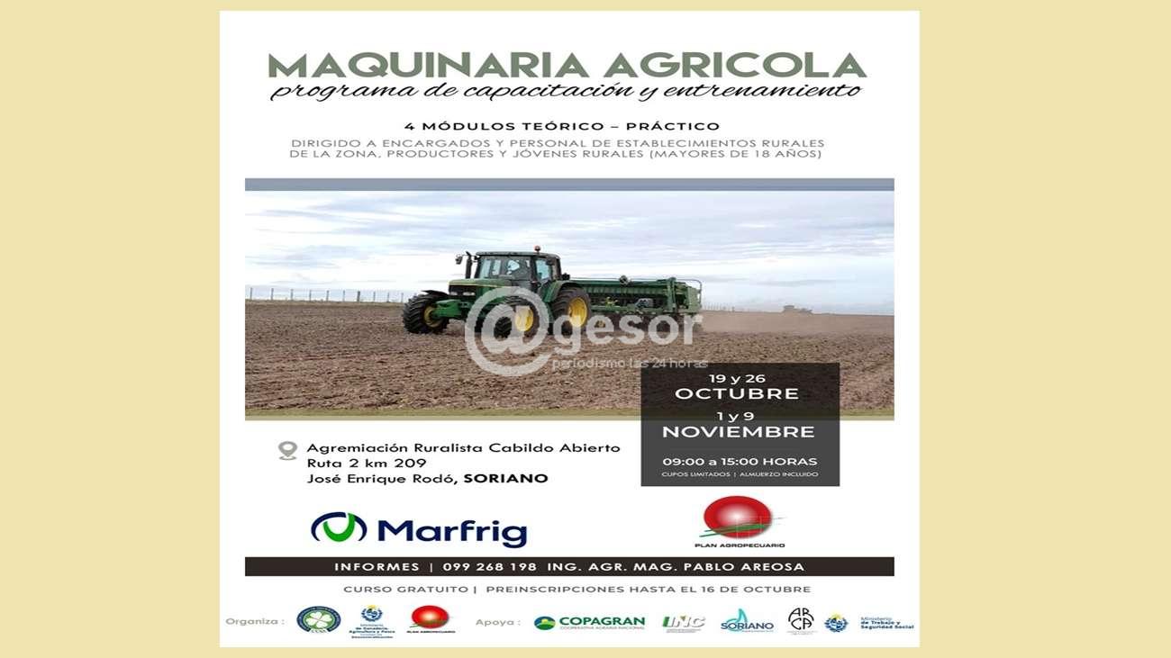 El Ministerio de Ganadería a través de Plan Agopecuario con el apoyo de diferentes instituciones organiza un curso de Maquinaria Agrícola. Se trata de un programa de capacitación y entrenamiento de carácter gratuito que se dictará en la Agremiación Ruralista de José Enrique Rodó con aplicación práctica en establecimientos rurales de la zona. Se realizará en 4 módulos, el 19 y 26 de octubre, y el 1 y 9 de noviembre.