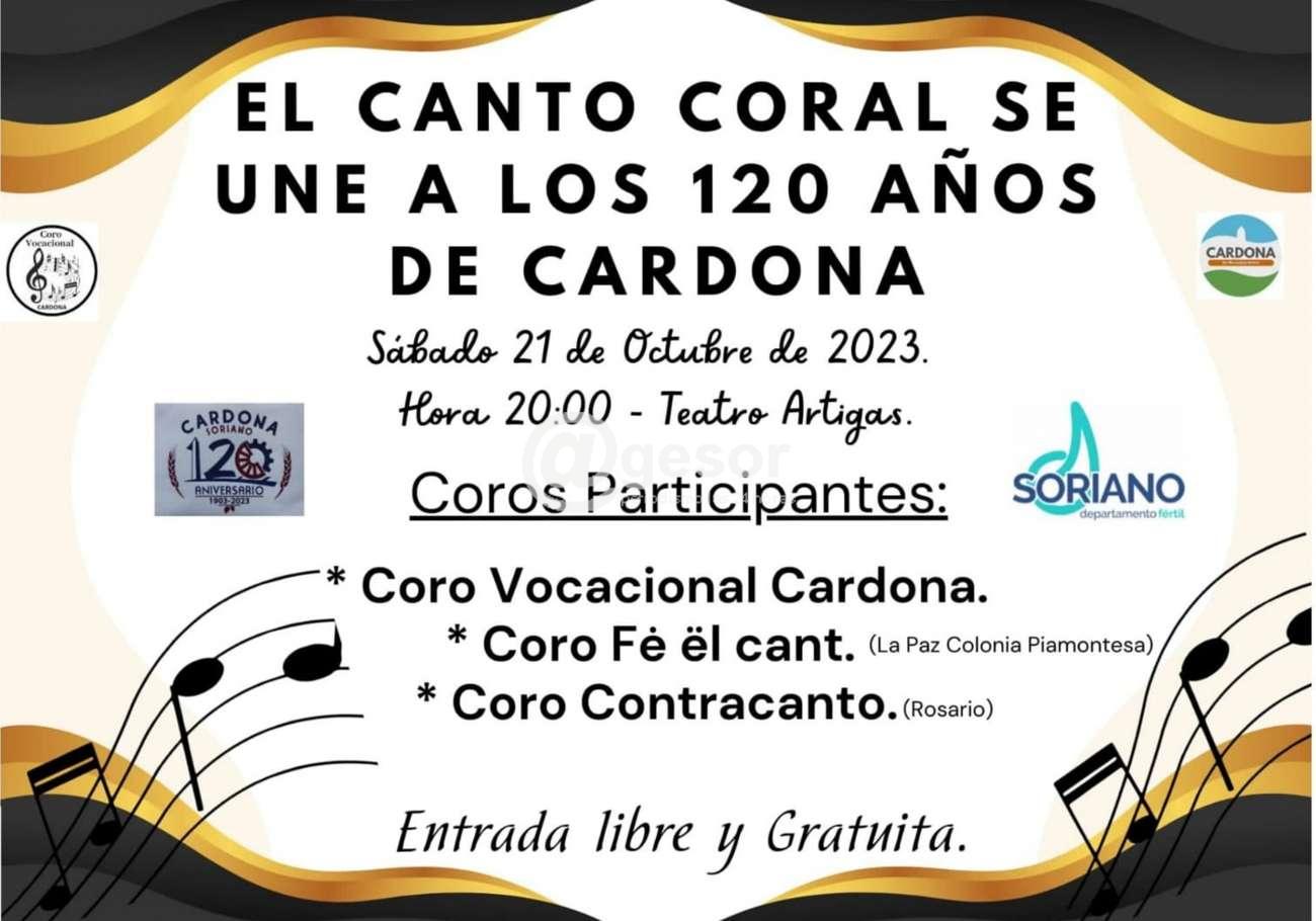 Con gran honor, el Municipio de Cardona extiende una cordial invitación a todos los habitantes para participar en una excepcional velada cultural: un Encuentro de Coros, que brillará en el marco de la celebración del 120º aniversario de esta ciudad. Este distinguido evento es organizado por el Coro Vocacional Cardona y contará con performances destacadas de agrupaciones corales invitadas, como el "Coro fé ël Cant” de La Paz, Colonia Piamontesa y “Contracanto” de Rosario.