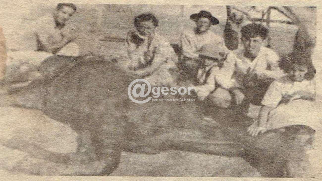 De izquierda a derecha: Humberto Marino Cherizola, un albañil que estaba trabajando en Las Dos Marías, Carmen María Inda, maestra de la Escuela, el domador de la estancia Fernando Acquistapace, un niño hijo de la cocinera del establecimiento rural, Eugenio Milans y Dora Milans.