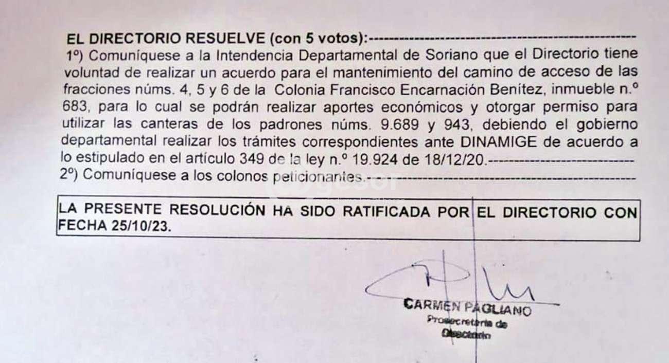 El Edil Luciano Andriolo informó: "Llegaron a buen término las gestiones que realizamos en Colonizacion para que el Instituto haga un acuerdo con la Intendencia de Soriano para el mantenimiento de los caminos internos de la Colonia Encarnación Benitez.