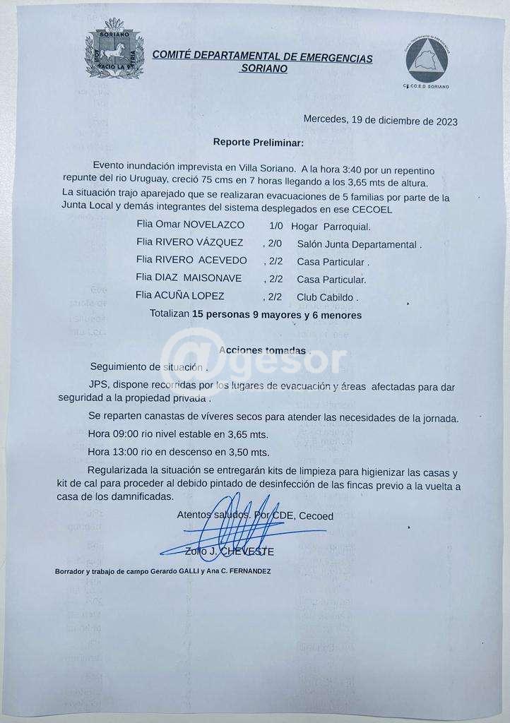 El Cecoed emitió un comunicado dando cuenta de  la intervención realizada en Villa Soriano producto de  la rápida crecida del rio Uruguay.  "A la hora  3,40  por un repentino repunte del río Uruguay, crecio  75 cms en 7 horas llegando a los 3,65  mts de algura. La situaciòn trajo aparejado que se realizaran evacuaciones de  5 familias por parte de la Junta Local y demás integrantes  del sistema esplegados  en ese CECOEL".