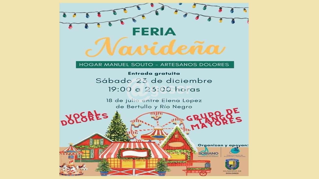 El Municipio de Dolores y la Intendencia de Soriano organizan una Feria Navideña, este viernes 23 de diciembre en 18 de julio entre Elena López de Bertullo y Río Negro. Participan el Hogar Manuel Soutoi, y artesanos de Dolores. Actuarán el Vocal Dolores y el Grupo de Tango de mayores.