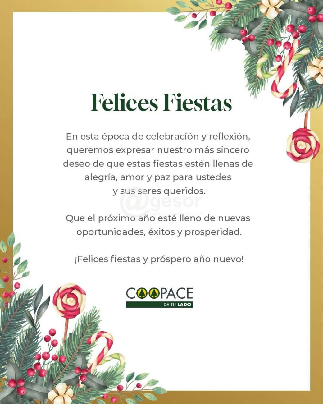 En esta época de celebración y reflexión, desde COOPACE queremos expresar nuestro más sincero deseo de que estas fiestas estén llenas de alegría, amor y paz para ustedes y sus seres queridos.