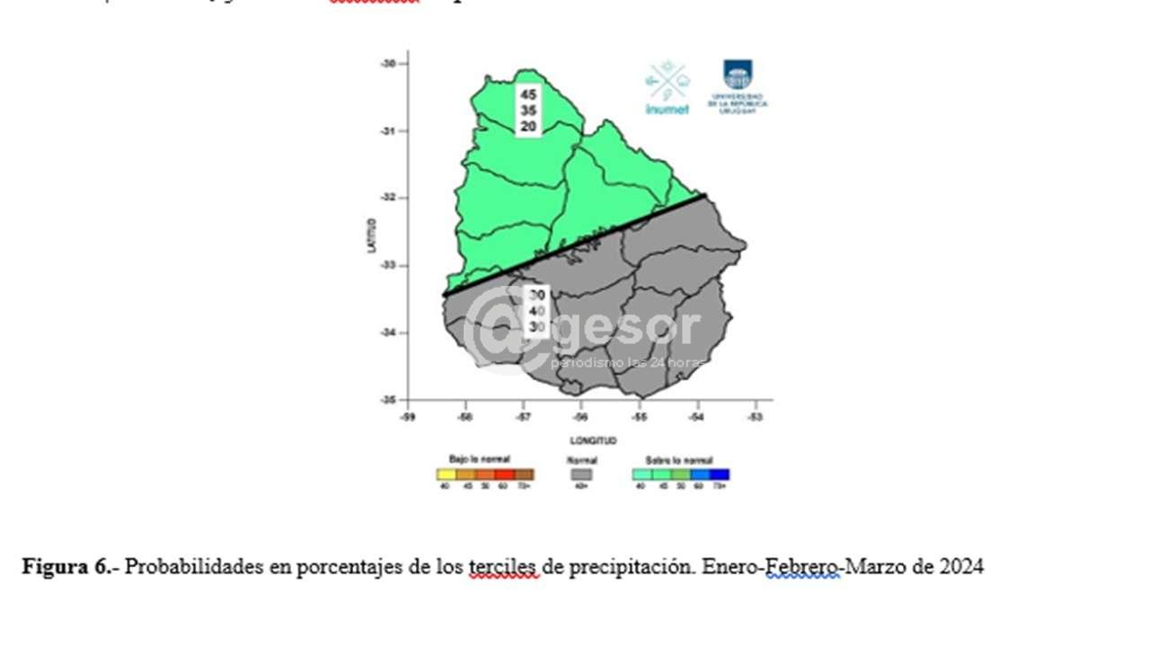Para el caso de Uruguay, se espera que la precipitación acumulada durante el trimestre enero-febrero-marzo sea por encima de lo normal y normal, distinguiéndose dos regiones con diferentes probabilidades (ver figura 1). En particular, en la región norte hay un 45 % de probabilidad de ocurrencia del tercil superior, un 35 % en el tercil medio, y 20 % en el tercil inferior. Por otro lado, en la región sur se esperan precipitaciones dentro del rango normal, con una probabilidad de ocurrencia del tercil medio de 40 %, y de los terciles superior e inferior de 30 %.