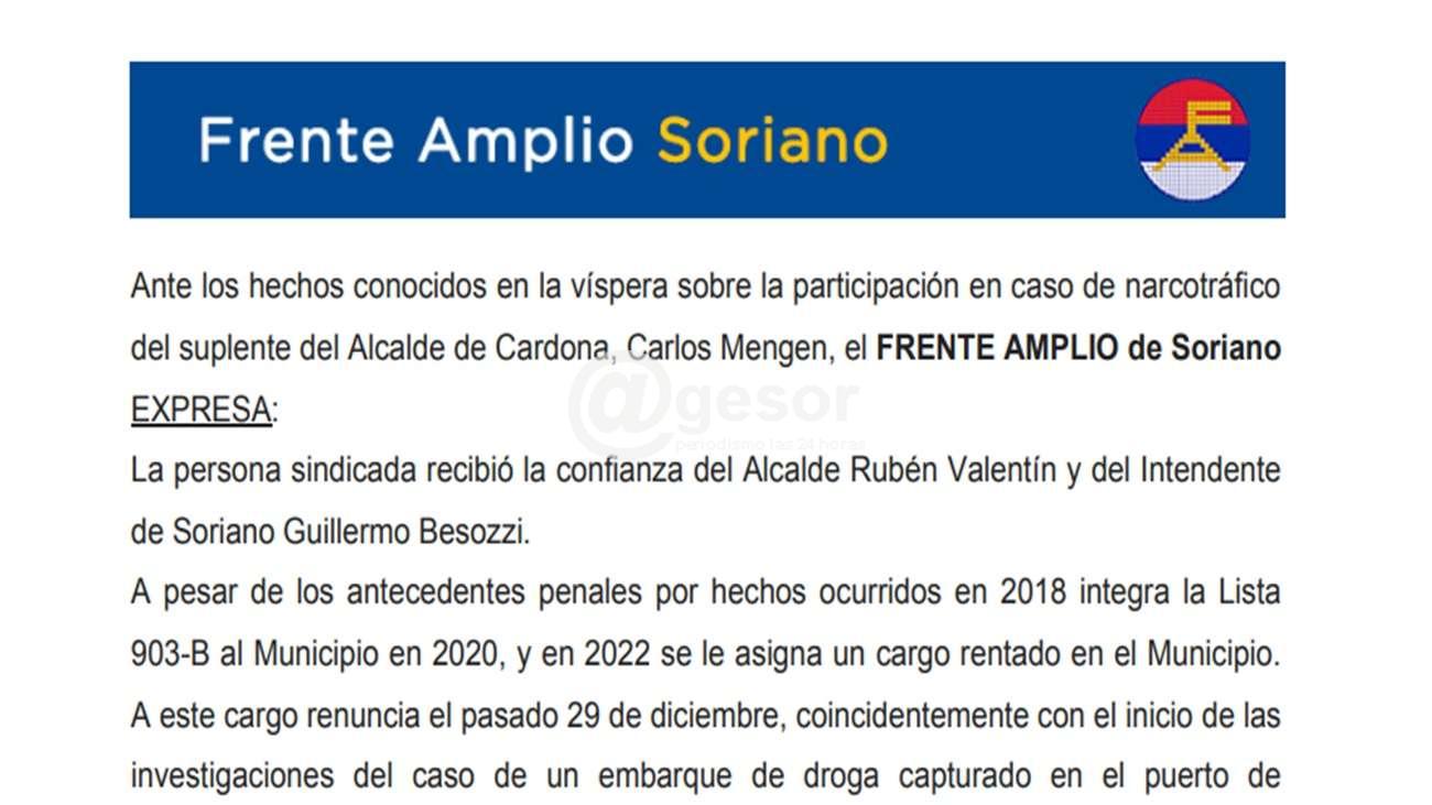 "Ante los hechos conocidos en la víspera sobre la participación en caso de narcotráfico del suplente del Alcalde de Cardona, Carlos Mengen, el FRENTE AMPLIO de Soriano EXPRESA: