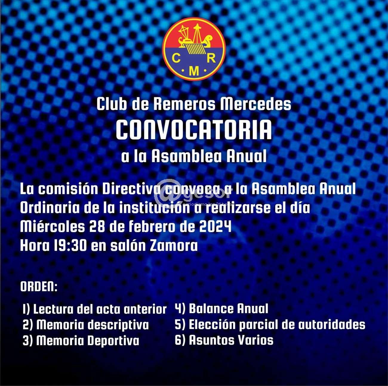 Este miércoles 28 Club de Remeros Mercedes convoca a Asamblea Anual, a partir de las 19.30 horas en el salón Zamora.