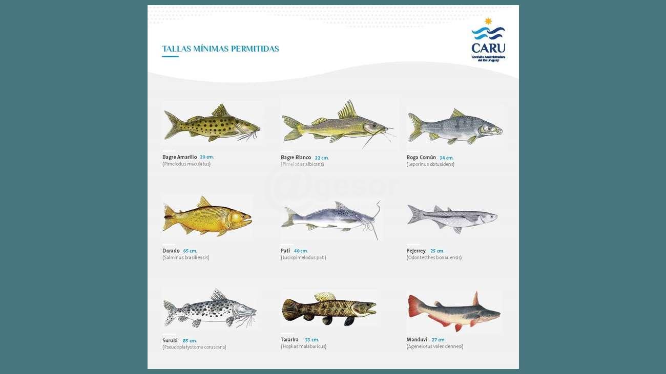 Por este motivo se recuerda al público que desarrolla actividades de pesca en aguas de la cuenca del río Uruguay, que deben respetar estrictamente la normativa acerca de las tallas mínimas de captura de las especies mencionadas en la siguiente Tabla. Individuos por debajo de esas longitudes deben ser devueltos al agua sin excepción y no pueden ser comercializados bajo ningún concepto.