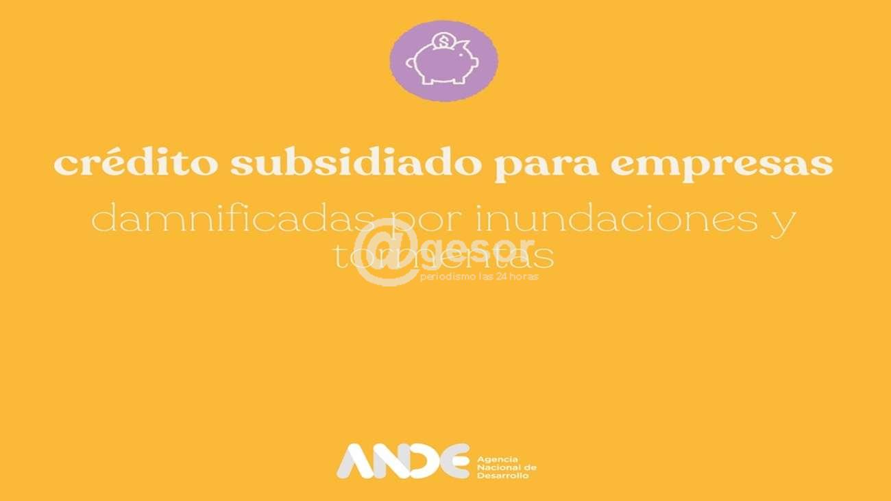 Ante la situación que se vive a causa de las inundaciones y turbonadas de viento ocurridas en los últimos días en varias partes del país, la Agencia Nacional de Desarrollo (ANDE) habilitó una línea de crédito con tasas de interés subsidiadas, más bajas que las del mercado, y con mayores períodos de gracia, para micro, pequeñas y medianas empresas (mipymes) que hayan sido afectadas por estos eventos meteorológicos adversos.
