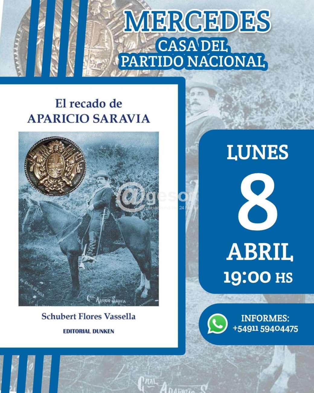 En la sede de la Departamental del Partido Nacional de Soriano, ubicada en calle Wilson Ferreira Aldunate 783 entre Artigas e Ituzaingó, en Mercedes, estará presentándose el libro de Schubert Flores Vassella, "El Recado de Aparicio Saravia", de la Editorial Dunken.
