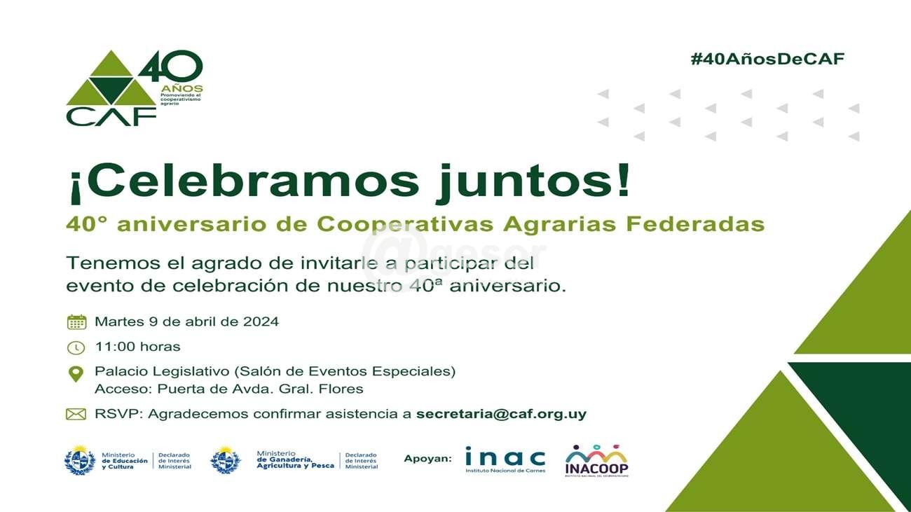 Con la Presencia de las Presidentas de ambas Cámaras, este martes 9 a las 11:00 horas en el Salón de Eventos Especiales, se realizará un encuentro con motivo de celebración del 40º Aniversario de la Cooperativas Agrarias Federadas (CAF). El intercambio permitirá reflejar el rol clave que desempeñan las cooperativas agrarias en el desarrollo sostenible.