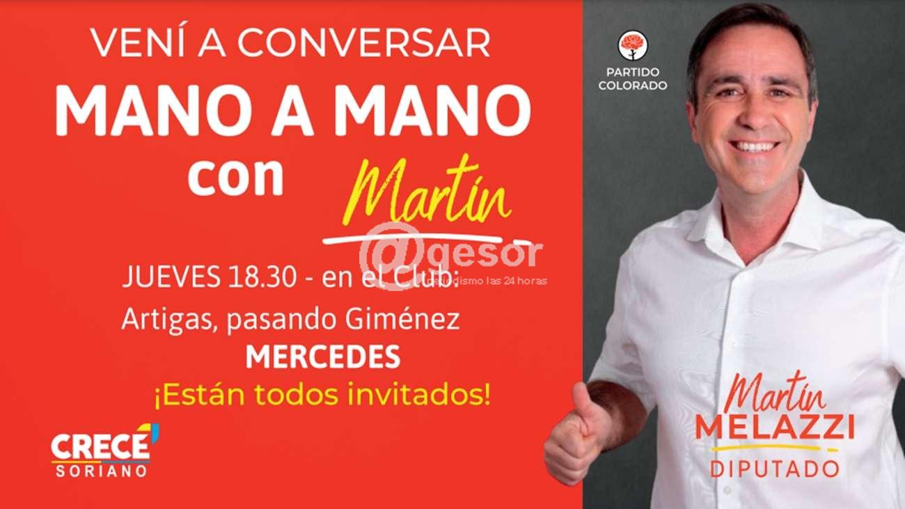 Este jueves 18,30 horas el diputado Martín Melazzi estará dialogando con los vecinos. Será en el club Artigas, pasando Giménez, de Mercedes.