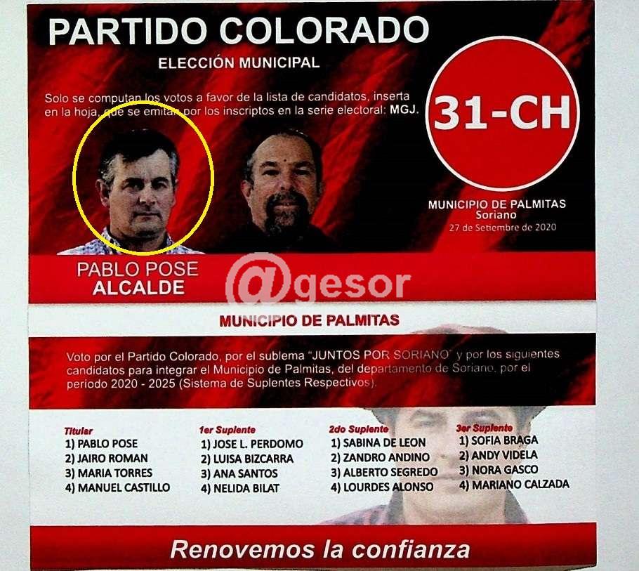 Exactamente en las Elecciones Municipales que se corrieron para setiembre 2020 por la pandemia, Pablo Pose que es oriundo de Egaña, pero vive en Palmitas desde al menos 2017, se presentó como candidato a Alcalde por la hoja de votación 31 CH del Partido Colorado con el .