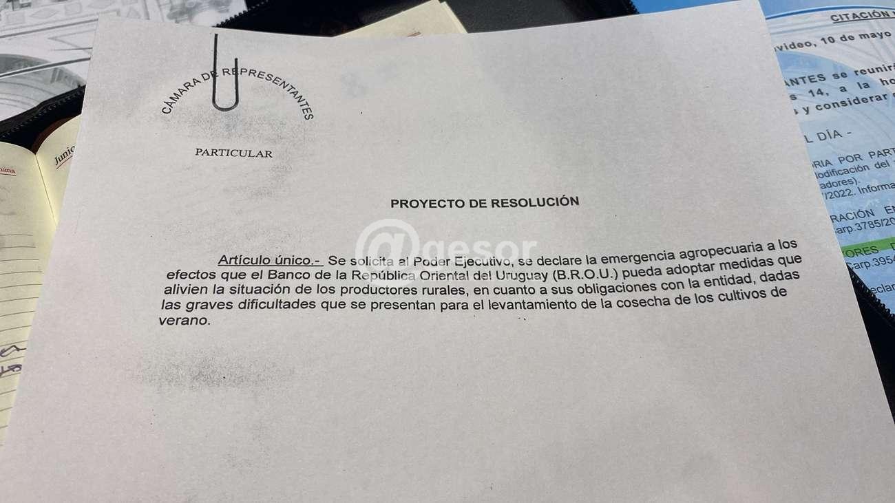El pasado día martes 14 de mayo en Cámara de Diputados se trató de forma “urgente” un Proyecto de Resolución por el que se solicita al Poder Ejecutivo la declaración de Emergencia Agropecuaria, para  que el Banco de la República Oriental del Uruguay (BROU) pueda adoptar medidas que faciliten a los productores rurales el levantamiento de la cosecha.