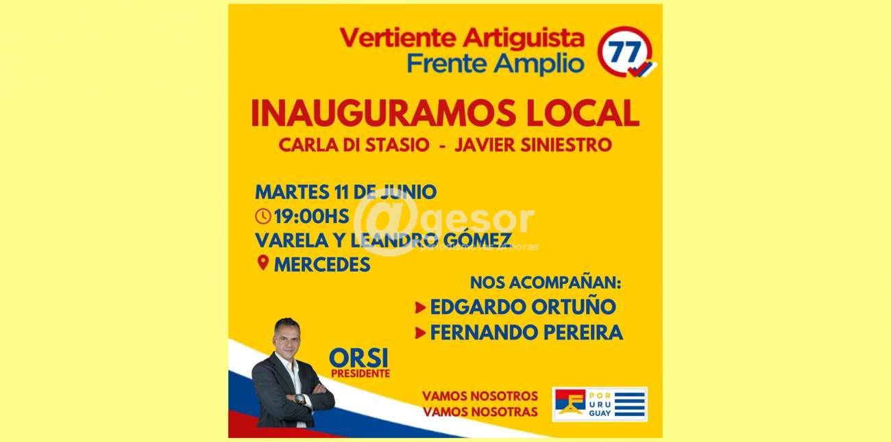 La Vertiente Artiguista, Lista 77, con Carla Di Stasio y Javi6+5er Siniestro, inaugura su local. Será este martes 11 de junio, a las 19 horas, en Varela y Leandro Gómez, de Mercedes.