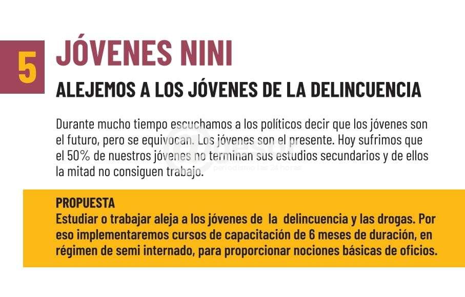 Estudiar o trabajar aleja a los jóvenes de la delincuencia y las drogas. Por eso implementaremos cursos de capacitación de 6 meses de duración, en régimen de semi internado, para proporcionar nociones básicas de oficios.
