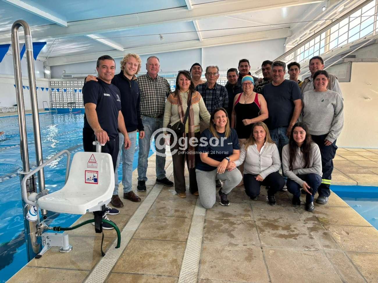 En la piscina municipal de Dolores, se colocó una silla hidráulica para personas con discapacidad que permite el ingreso y salida del agua de manera segura y cómoda.