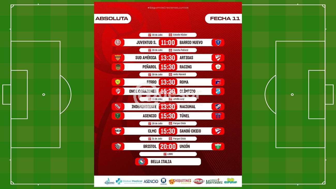 Se reunió la Liga Departamental de Soriano bajo la presidencia del Dr. Pablo Marrero a los efectos de fijar la decima primera fecha del torneo mercedario a disputarse el próximo domingo, y parte el día miércoles que viene. La fecha comienza a la hora 11 el domingo con el partido entre Juventud Soriano y Barrio Nuevo en el estadio Koster. En cancha de Peñarol juegan desde las 13 y 30 horas Sud América yArtigas, y a las 15 y 30 horas se disputará el gran partido entre Peñarol y Racing. En el Moranti a las 13 y 30 horas juegan Ferro y Roma, y a segunda hora Once Corazones y Olímpico.