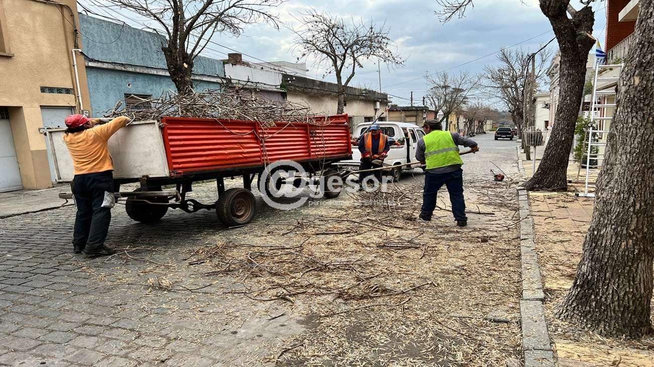 El trabajo de poda se realiza en varios puntos de la ciudad de Mercedes, donde se ha efectuado la poda de limpieza de ramas bajas y otras que puedan estar afectando el cableado o las fachadas de algunas viviendas.