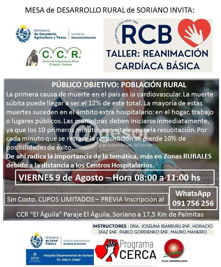 La Mesa de Desarrollo Rural de Soriano está invitando a taller de Reanimación Cardíaca Básica (RCB) a desarrollarse en el Centro de Capacitación Rural El Aguila en Soriano con la organización de la Unidad de Descentralización del MGAP este viernes 9 de agosto de 8.00 a 11.00 horas.