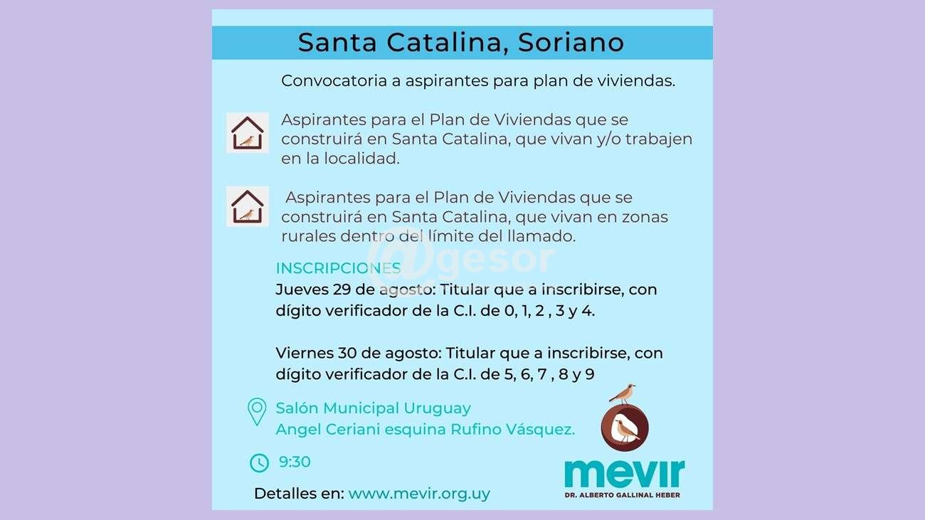 Por más información: https://www.mevir.org.uy/index.php/llamados-a-vivienda-nueva/217-convocatoria-a-aspirantes-para-plan-de-viviendas-en-santa-catalina-soriano