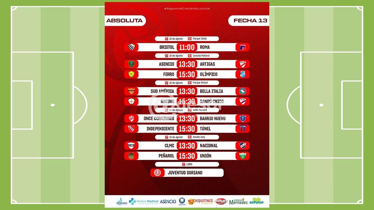 Se reunió la Liga Departamental de Soriano a los efectos de fijar la decimo tercera fecha del torneo mercedario a disputarse el próximo domingo. Dicha fecha es importante por los puntos que están en juego y lo apretada la tabla de posiciones. Comienza el domingo a las 11 de la mañana en Parque Chick entre Bristol y Roma. Se recuerda que el Estadio se utilizará el sábado para la selección de Soriano en sub 14 y sub 15- En la tarde del domingo desde las 13 y 30 horas Asencio enfrenta a Artigas, y a las 15 y 30 horas el líder Olímpico enfrenta a Ferro en cancha de Peñarol.
