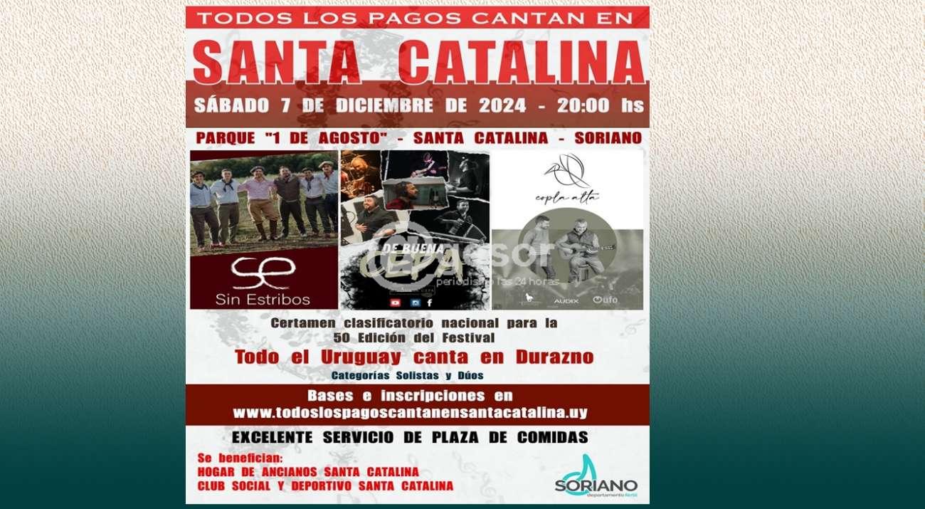 La Intendencia Departamental de Durazno y la Comisión Organizadora del Festival "Todos los Pagos Cantan en Santa Catalina" invitan a solistas y dúos de todo Uruguay, con excepción de los artistas del departamento de Durazno, a participar en el evento *PRE DURAZNO 2024. Este certamen se llevará a cabo el sábado 7 de diciembre de 2024 en Santa Catalina.