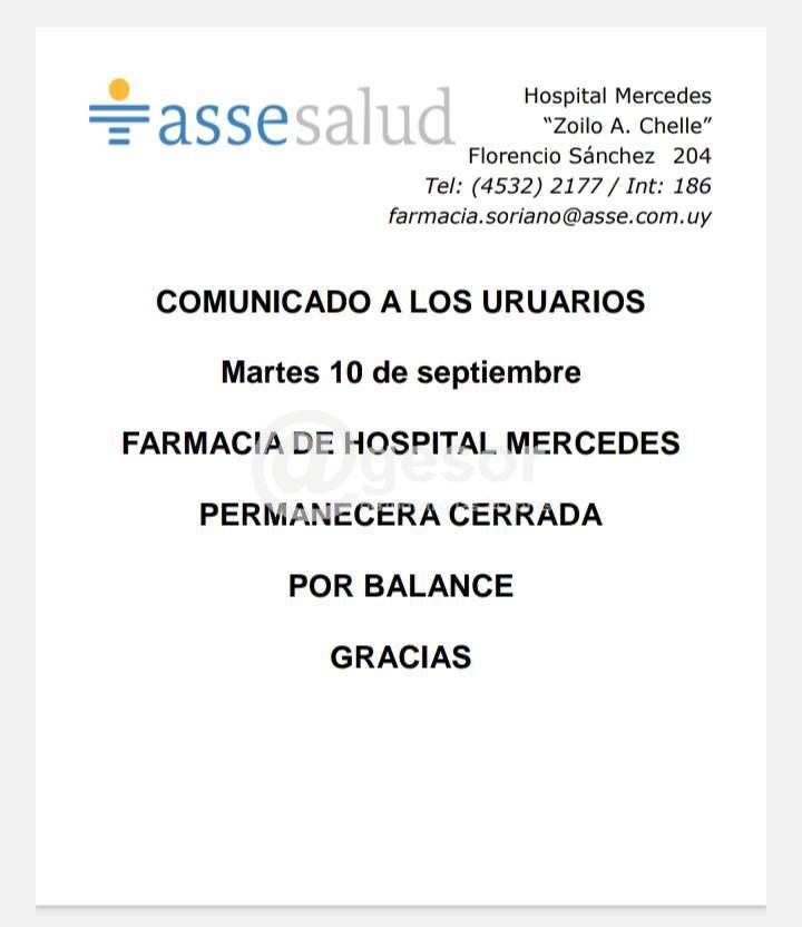 Este martes 10 de setiembre la farmacia del Hospital Mercedes permanecerá cerrada