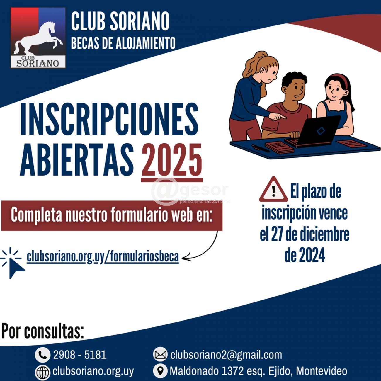 Club Soriano habilitò el período de inscripciòn para sus Beca de Alojamiento para el ejercicio 2025. Esta beca está dirigida a los jóvenes sorianenses que desean realizar estudios terciarios en la capital.