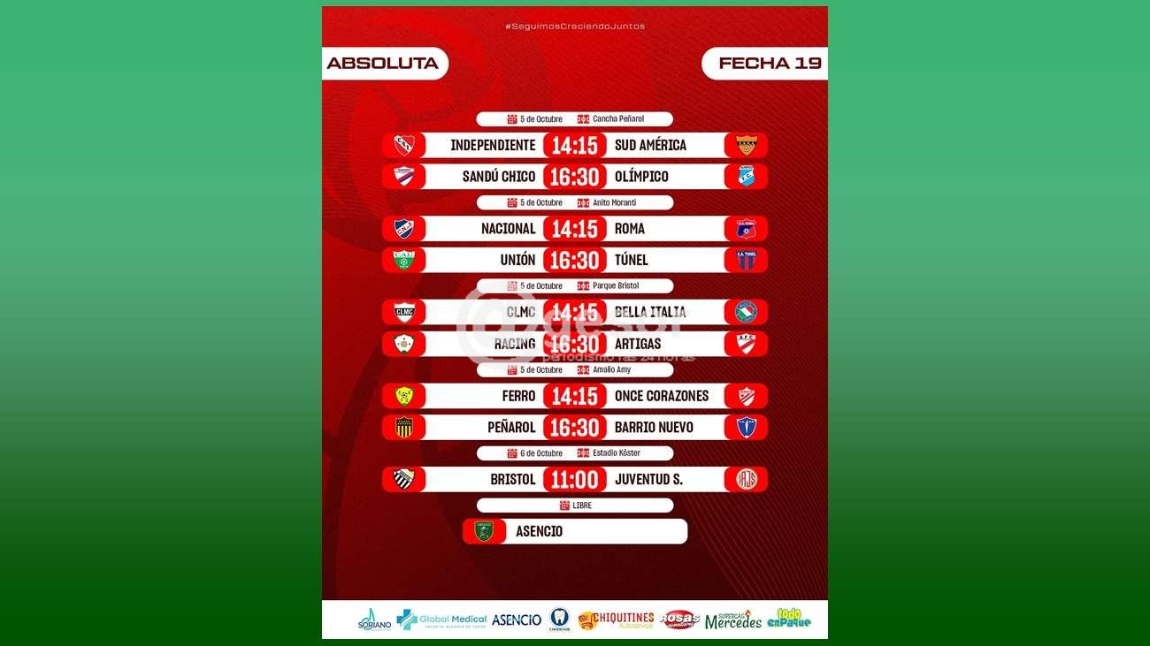 Racing, el actual líder, y que al ganar se consagrará campeón de la primera parte del año, enfrentará a Artigas a las 16 y 30 horas en Parque Bristol. Mientras que en misma cancha desde las 14 y 15 juegan Nacional y Roma.
