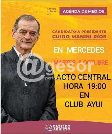 Este martes 8 de octubre llega a Mercedes el presidenciable GUIDO MANINI RÍOS de Cabildo Abierto para efectuar acto central, que se ha fijado para la hora 19.00 en el Club Ayuí.