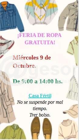 El Municipio de Cardona a través del área de Asuntos Sociales y Familia, invita como todos los meses a participar de una feria de ropa gratuita que se llevará a cabo mañana, miércoles 9 de octubre, en las instalaciones de Casa Fértil. La actividad se desarrollará de 9:00 a 14:00 horas y está dirigida a todas las personas interesadas en acceder a prendas en buen estado, sin costo alguno.