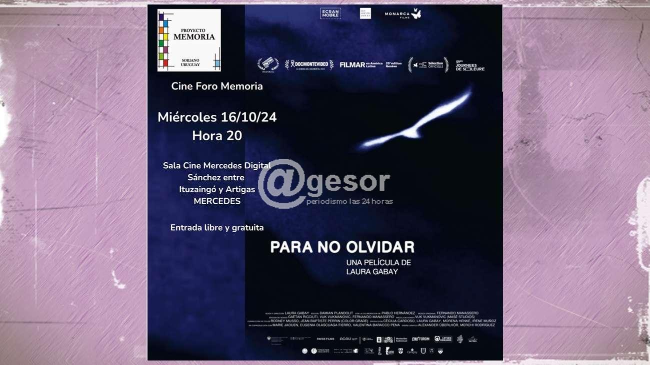 Continúa el ciclo de Cine Foro Memoria, de la Comisión Memoria, Justicia y contra la Impunidad de Soriano. El miércoles 16 de octubre en Cine Mercedes digital, se proyectará "Para no olvidar", de Laura Gabay. Una película del año 2023 que explora la relación videográfica entre dos exilios. Tras la muerte de su padre, la directora Laura Gabay trata de resolver el misterio de la figura paterna, que huyó de la dictadura uruguaya, a través de una obra de collage basada en los archivos familiares. Una película hipnóticamente bella que da testimonio del dolor del exilio y de los grandes cambios del pasado siglo. (fuente: https://es.unifrance.org/)